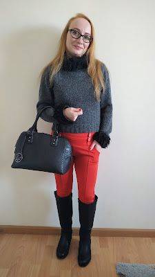 UsuńBardzo ładna stylizacja. Czerwone spodnie do czarnych kozaków i szarego sweterka- super!